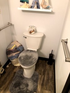 my bathroom facing my bedroom and this is a big enough turnaround to turn a wheelchair or walker without crashing which is why the counter is rounded