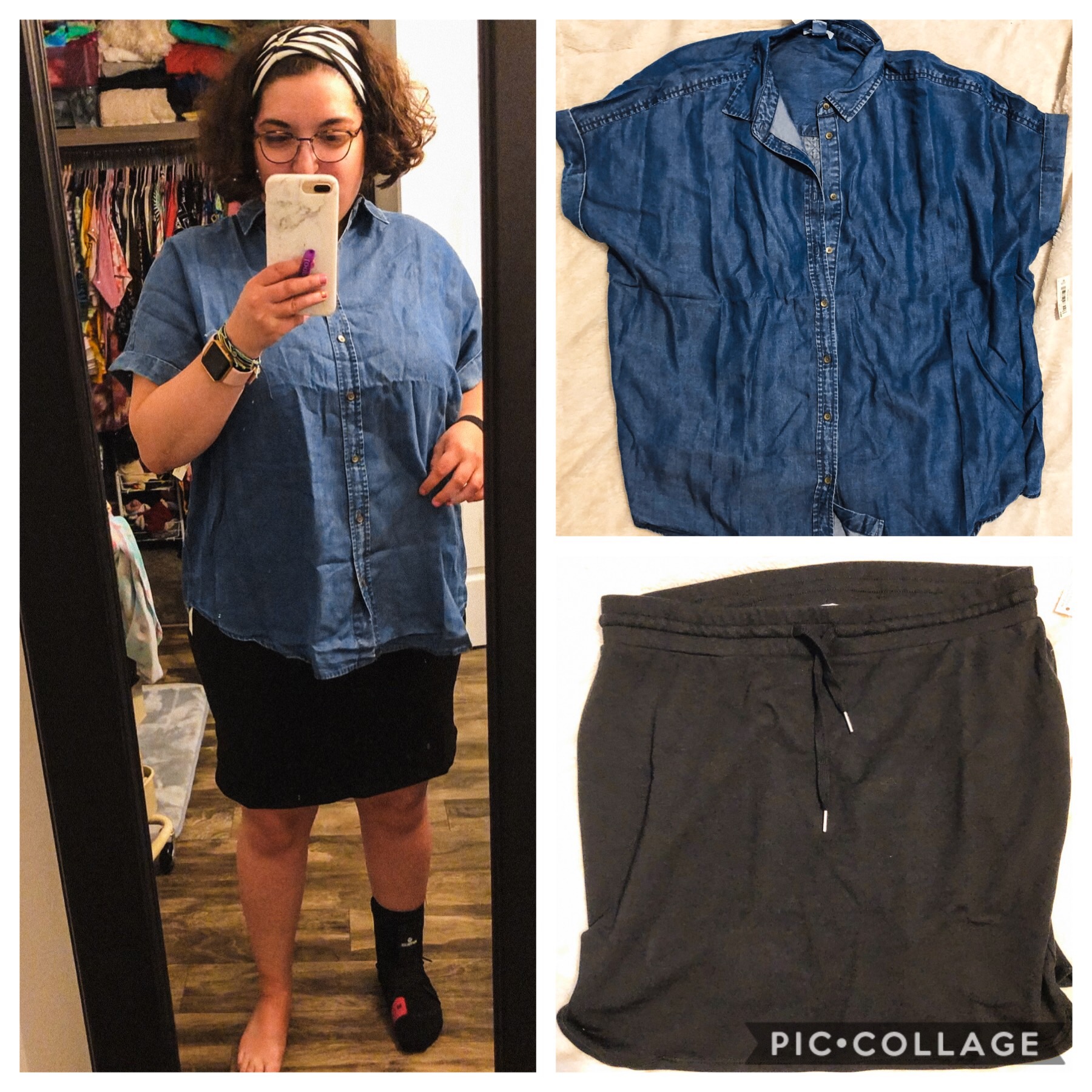 Ok I have to be honest this one really surprised me. I just ordered the skirt to try it but I was really looking forward to this chambray shirt. The skirt comes in other colors and was priced around $22. I sized up in the shirt ordered in medium wash (getting an xl) comes in different washes and was $26. I stayed true to size in the skirt (ordering a large). I would’ve kept this skirt but it doesn’t have pockets. The material was so soft! I added it to my wishlist so if it ever goes on major sale I may get it. I recommend sizing up. Ok back to the shirt. It was so soft and cute. The way this shirt was made was not for my body type. It pulled weird in the back and the sleeves almost like it was all connected instead of the sleeves being “free” if that makes sense.