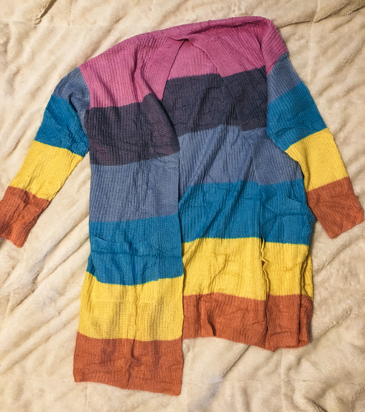 This wasn’t a prime wardrobe eligible item but I ordered it and it came on the same day! I got a large and still have quite a bit of room. I got the colorful rainbow one and it is linked directly. Don’t panic like I did when you get it in the mail it feels like a shoe. They air seal it or something so it is packed in there but when you open it the cardigan quickly puffs out. This material is so soft! I 100% recommend this! Cardigan was around $32 dollars. Boutiques carry this type of cardigan for much more.