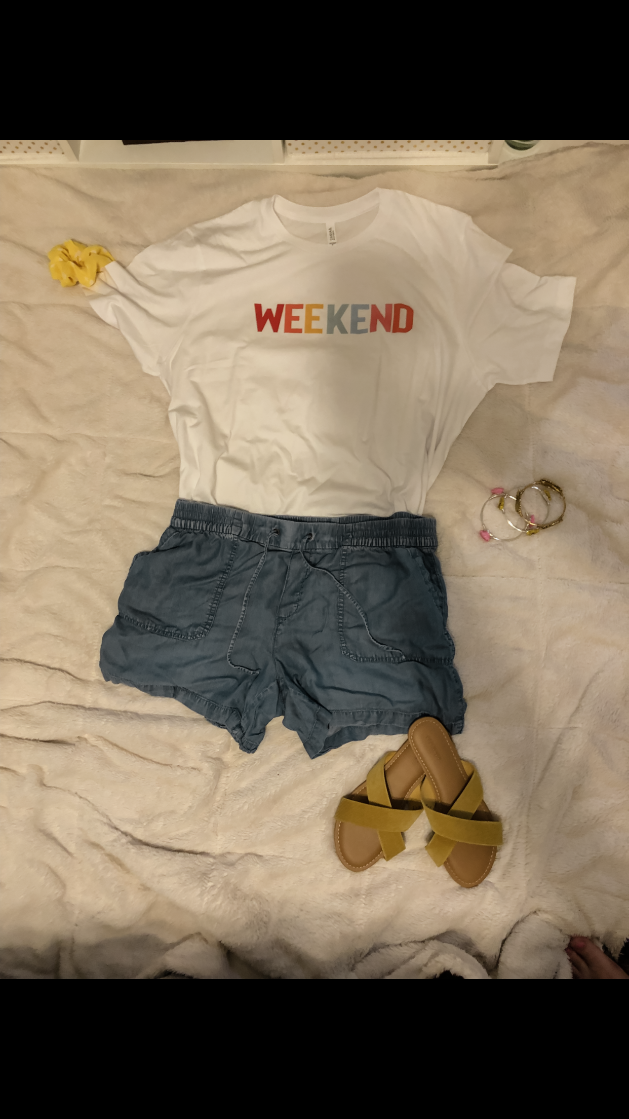 T-Shirt (xl) // Similar Shorts (large) // Similar Shoes // Scrunchie (colors vary)//Bracelets from The Sandy Pearls