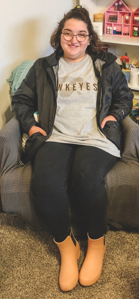 Similar Shirt* (xl) // Similar Pants* (large) // Similar Rain Jacket* (xl) // Similar Rain Boots* // Scrunchie