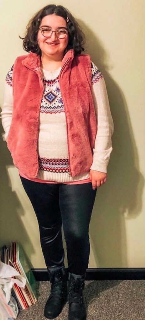 This sweater is a great option. You can pull so many colors out. I went with pink to make it more of a Valentine’s look. I could also wear a blue vest to pull out the blue instead of the pink. Old Navy doesn’t have this particular sweater anymore. It comes in a different color that is more non traditional Valentine’s Day outfit.