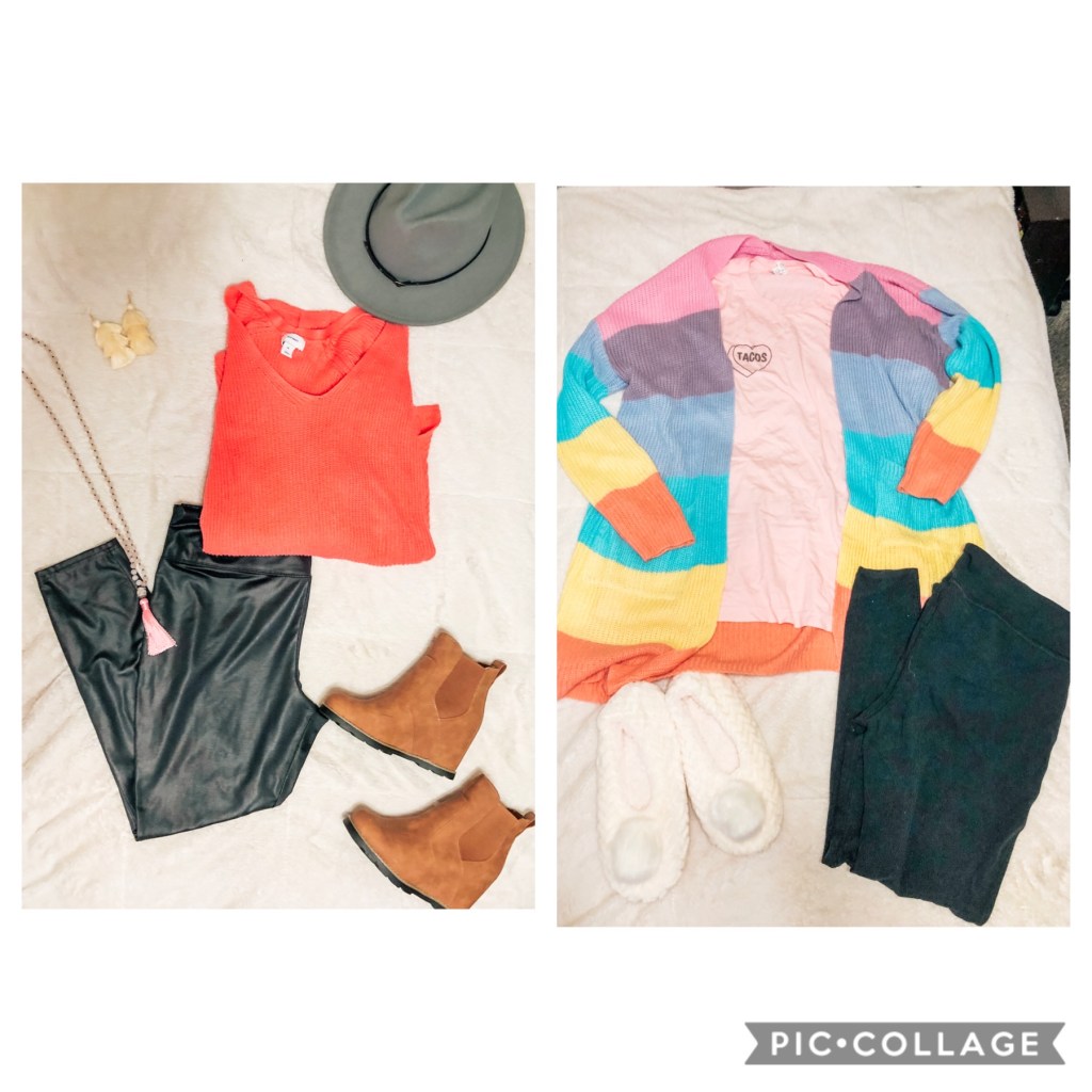 Similar Pink Sweater* (xxl) // Similar Faux Leather Leggings* (xxl) // Similar Shoes* (7) // Similar Earrings // Hat — Cardigan* (large) // Similar Pants (Large) * // Similar Shirt* (xl)