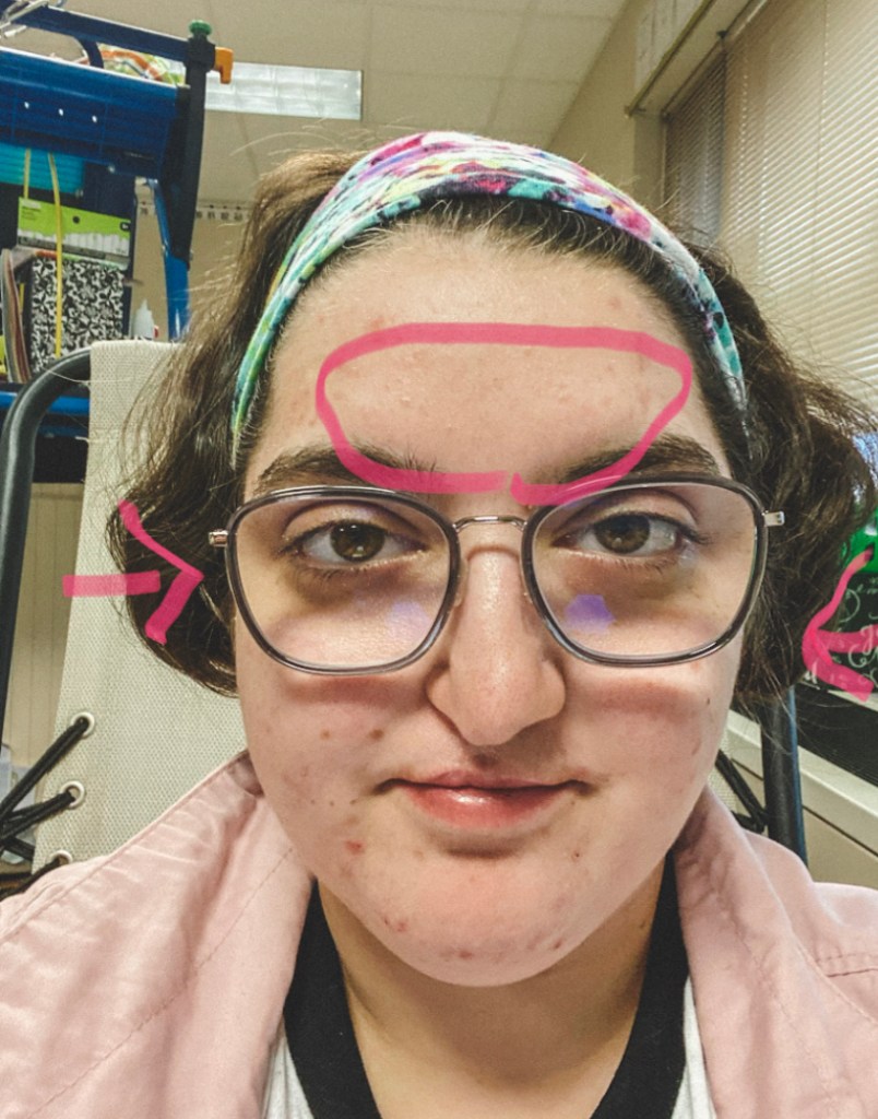 I’m going to take you through the appointment a little bit because I was being validated the whole time and wait for it he was helping me with my stomach pain more than my gastroenterologist has! So I had this appointment with the doctor who is an allergist & immunologist. He was so knowledgable and had such good bedside manners! First of all he didn’t make a single comment or question my previous diagnoses. He didn’t make me ever feel like anything was my fault in fact he gave me straight up facts so I couldn’t even try to blame it on myself. He spent an hour with me. This appointment was more focusing on the allergy part and he would take time to explain things to me. We even were joking around some which is always a good sign. The next thing I learned was so fascinating and makes so much sense. First of all he looked up my nose to see what was going on with my allergies. He said my right side was basically swollen shut and my left side wasn’t far from that. I asked if it had anything to do with my cleft lip and palate. He said it plays into that because it changes things structurally and that’s probably why that side was more swollen. He got out a picture of the inside of your nose and he explained everything to me. Your nose is pretty much an air filter for you. Then it goes through the part that creates some mucus which normally just goes down your throat normally without even noticing it really. Then he asked do you know what your sinuses do? I honestly never really thought about that I just figured it had something to do with mucus and snot. I was wrong! They are air pockets – you have 4 on the “front” of your face, forehead, and cheeks. You can see in the picture below that mine are swollen. I circled where it’s swollen and you can see my cheeks are swollen. Some days it’s really noticeable. I always said somedays my glasses feel really tight and I wasn’t lying it’s because my cheeks are swelling.