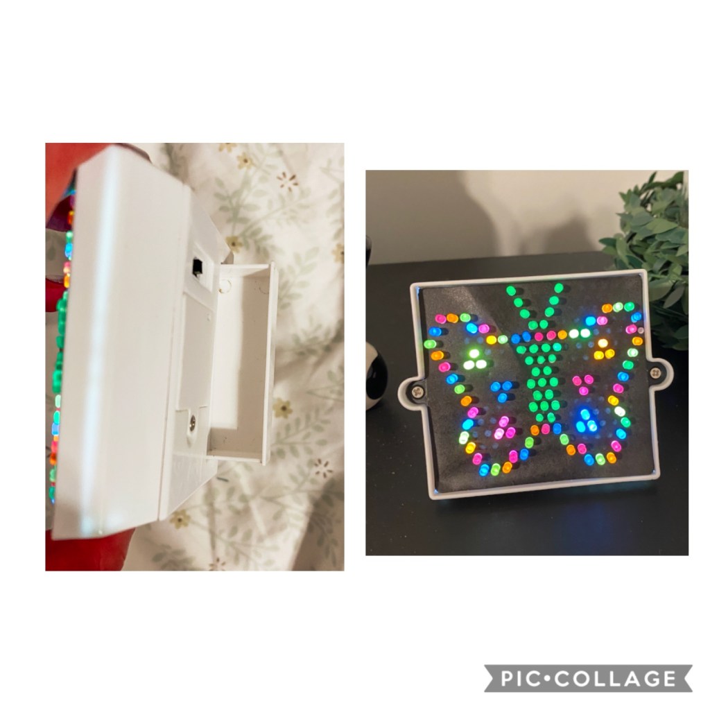 I saw this on Tik Tok after an influencer Hello Happy Mom! You can follow her on Instagram here https://www.instagram.com/hello_happy_mom/?hl=en. It’s the smallest lite brite! As a kid I remember playing with the original one! This has little pegs and lights up and it has the little stencils you can follow! On the back you can store the extra pegs mine are still in a bag because I discovered this as I was taking the pictures for this blog post! It comes with the battery all ready to go!