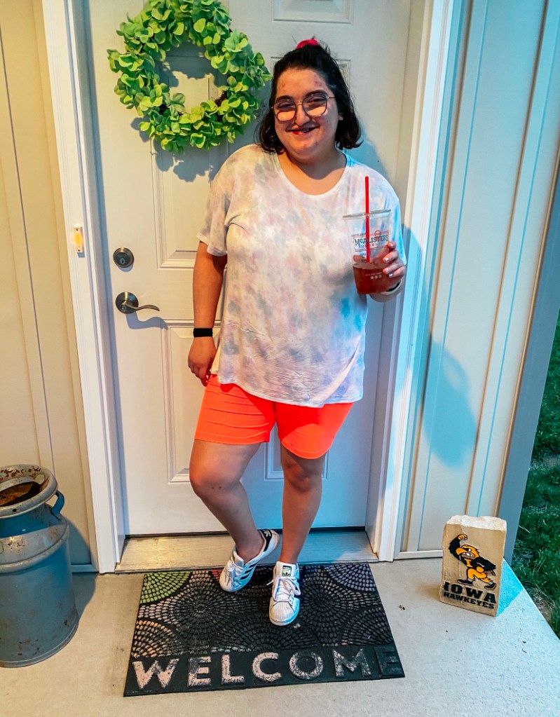 I didn’t jump on the bike short trend last year! I kept hearing good reviews on their bike shorts! I picked these bright pink ones*! They are so soft and comfy! I sized up to an xl. I will warn you that I wouldn’t wear a regular shirt or tank with these. I feel most comfortable with a longer top like I showed below! I don’t think it’s true for every pair of bike shorts and it maybe depends on the color. It wasn’t see through really it just shows a lot of bumps and lumps at the top of the waistband and right below it, but like I said if you wear a longer shirt it’s not a problem. I styled it with this super fun scrunchie, but unfortunately it’s sold out here are two more* I got also! Also this shirt* is my new favorite! I love the little tie dye and it’s soft and long! I’m wearing a large.