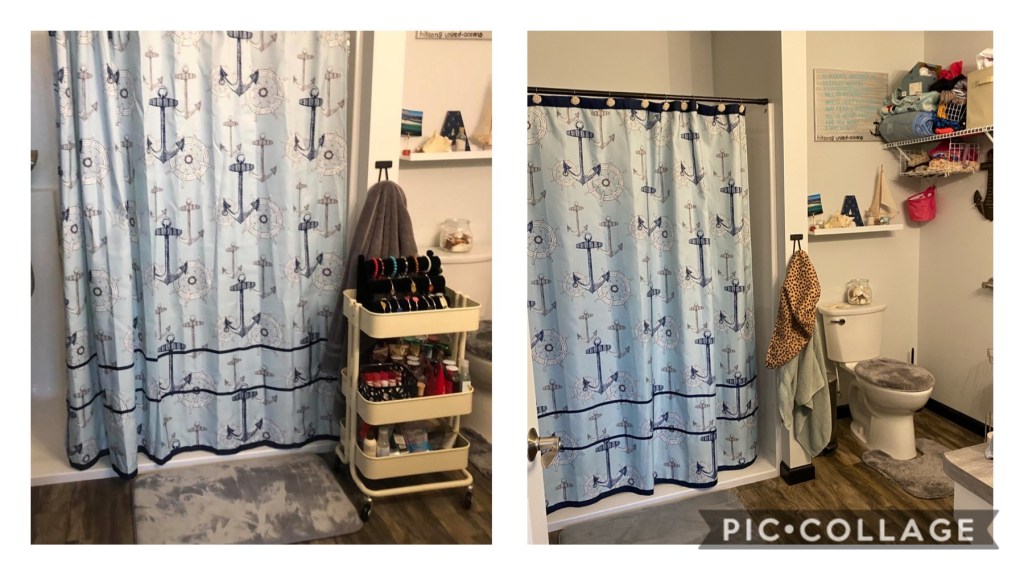 I know it make a look a bit messier on the after but it’s much more easier to access. Since I needed an accessible bathroom I don’t have a lot of storage since the area below my sink is open. It’s open so I can take my walker or wheelchair right under. I added shelves from Menard’s that really matched my countertop. Many of the storage/decorative things I got from Hobby Lobby and the Dollar Tree! Since I added the shelf above my mirror I was able to put my towels up there which meant I could get rid of the cube under the sink.