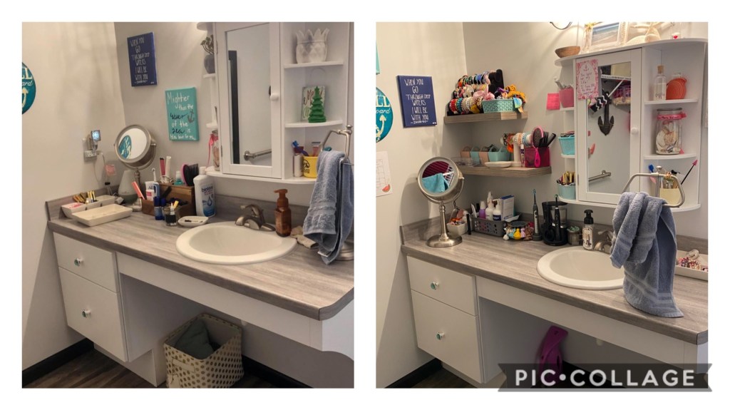 I wanted to make my bathroom even more accessible. I was able to get rid of my cart. We had some leftover shelving from my closet and we decided to add it to the wall to get more storage. My shower is a walk in. I have some rails in the bathroom to help me. My bathroom is completely ADA complaint and accessible. On a side note they designed my bathroom so that if someday I’m in my wheelchair more I can do a complete turn without bumping into anything. They also curved the part of my countertop so I wouldn’t bump into it. There are so many things in this house that I never would’ve thought would make a difference but they do!