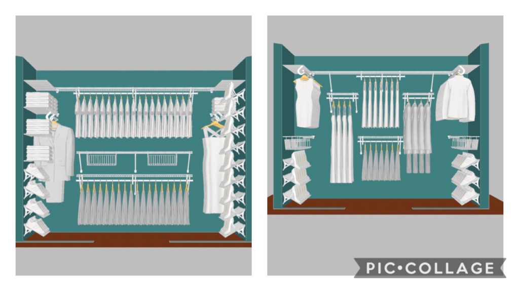 I was so thankful to finally have my closet re-done. Thanks to the stimulus check I was able to make this happen. Menard’s has a thing through ClosetMaid to design a custom closet please note it’s unavailable right now. I’m guessing it’s due to COVID so if this is something you want keep checking back! It only costs $5. You have to give them the measurements of your closet. They give you 2 designs and you can have them re-design it once with no extra fees. I didn’t have them re-do it because I loved this option. We decided to change it a little bit and add more shoe racks. Also if you go this route they send you the shopping list and the item numbers and how much of what you need. Thanks so much to my Mom and sister for putting together this closet! There is some diy you have to do. They had to cut the wire shelves to certain dimensions which took work. It took about a week for us because we did a little bit each day because it requires a lot of work and time. I would recommend this to anyone but make sure you have someone who can put it together. You can have them come in and put it together but that gets expensive quickly. I love that I have top and bottom storage. I cut the liner and put that on top of the bottom shelf. It made laying my t-shirts there much easier.
