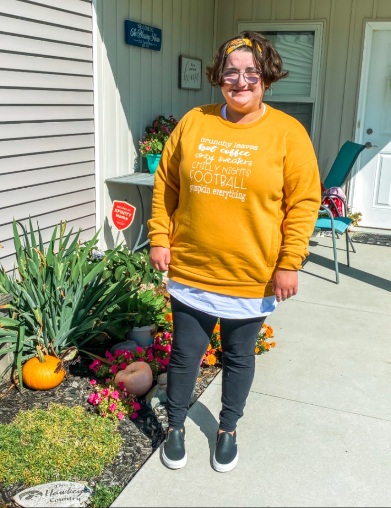 I love adding a fun fall sweatshirt to any look! This year it seems like a popular fall trend will be wearing a long undershirt with a crewneck. I love adding these leather vans in to add more of a fall look. If it’s hot swap them out for sandals and throw a fall tshirt on instead of a sweatshirt.